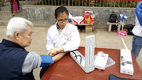 同学们为老人测量血压