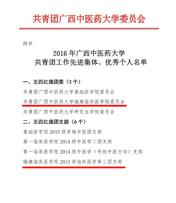 根据共青团广西中医药大学委员会《关于表彰2016年广西中医药大学共青团工作先进集体、优秀个人的决定》(校团字〔2017〕13号)精神,我院多个集体和个人获评2016年广西中医药大学共青团工作先进称号,具体如下: