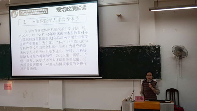 会上,王瑜主任从住培政策解读、住培现状介绍两个方面,以临床医学人才培养体系、住培类型及招收对象、我区目前中医西医规培基地、2017届我院毕业生规培统计分析为内容对“住院医师规范化培训”进行全面剖析。王瑜主任指出了全科医学、儿科等专业医学人才紧缺的现状,还重点介绍了全科医师规范化培训的具体政策扶持和区域医疗联合体的建立及趋势。