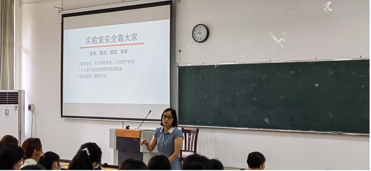 另外,药学实验综合分中心韦建华老师在试剂安全、生物安全、废弃物处理、水电安全等多方面的安全注意事项进行了细致全面的介绍,并对实验室安全检查中各实验室存在的安全隐患进行提醒,要求各实验室自查,对存在的安全隐患进行整改,强调学生在假期开展实验应遵守操作规程,并注意做好安全防护。切实做好实验室安全工作,避免实验室安全事故的发生。