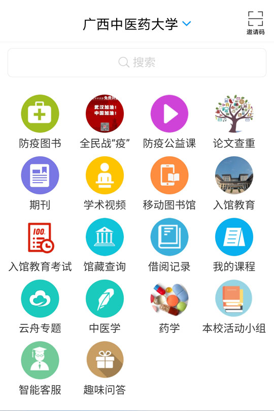 微信或QQ扫描”学习通“二维码,也可在应用商店搜索"超星学习通"下载安装该APP;用手机号注册登录,再绑定“学校/机构码”(广西中医药大学)和个人借阅证号(与校园卡一致,学号或工号);进入学习通首页后请点击右上角的“邀请码”,然后输入邀请码:yzgxzyydx,便可进行图书检索: