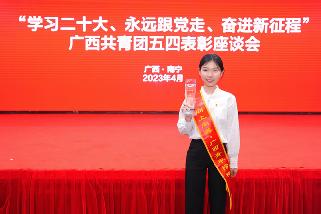 虞亚楠同学意志坚定,刻苦学习,在学习之余也不曾放弃提升自我。她曾荣获第三届“青年先锋”优秀大学生荣誉称号、我校二等学业奖学金、我校2022年“青春献礼二十大助学筑梦铸信念”资助主题演讲比赛二等奖、第八届中国国际“互联网+”大学生创新创业大赛校赛二等奖等奖项。她们树立了勤奋刻苦、不断进取的桂中医学子形象,激励着我校学子刻苦学习,积极进取。