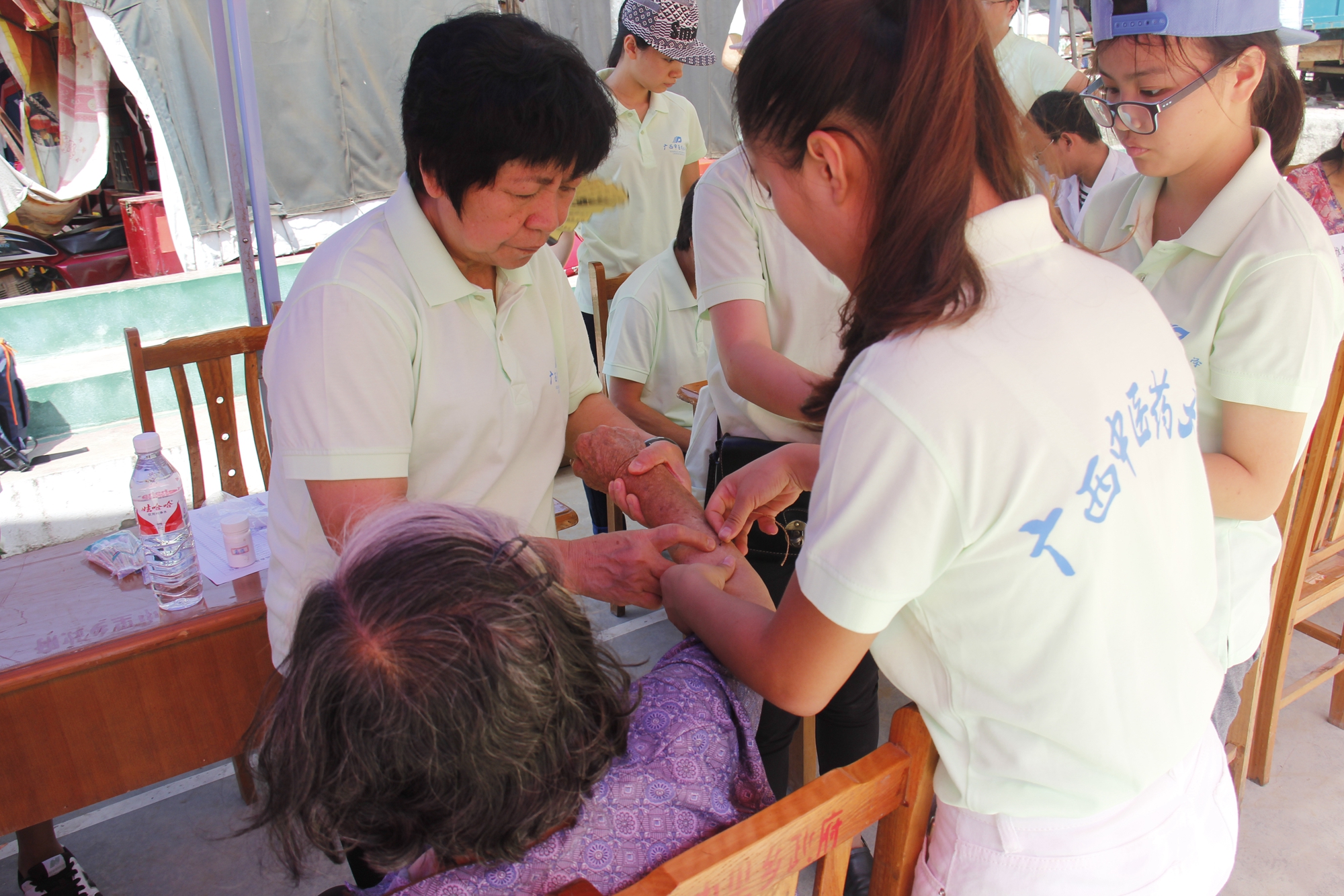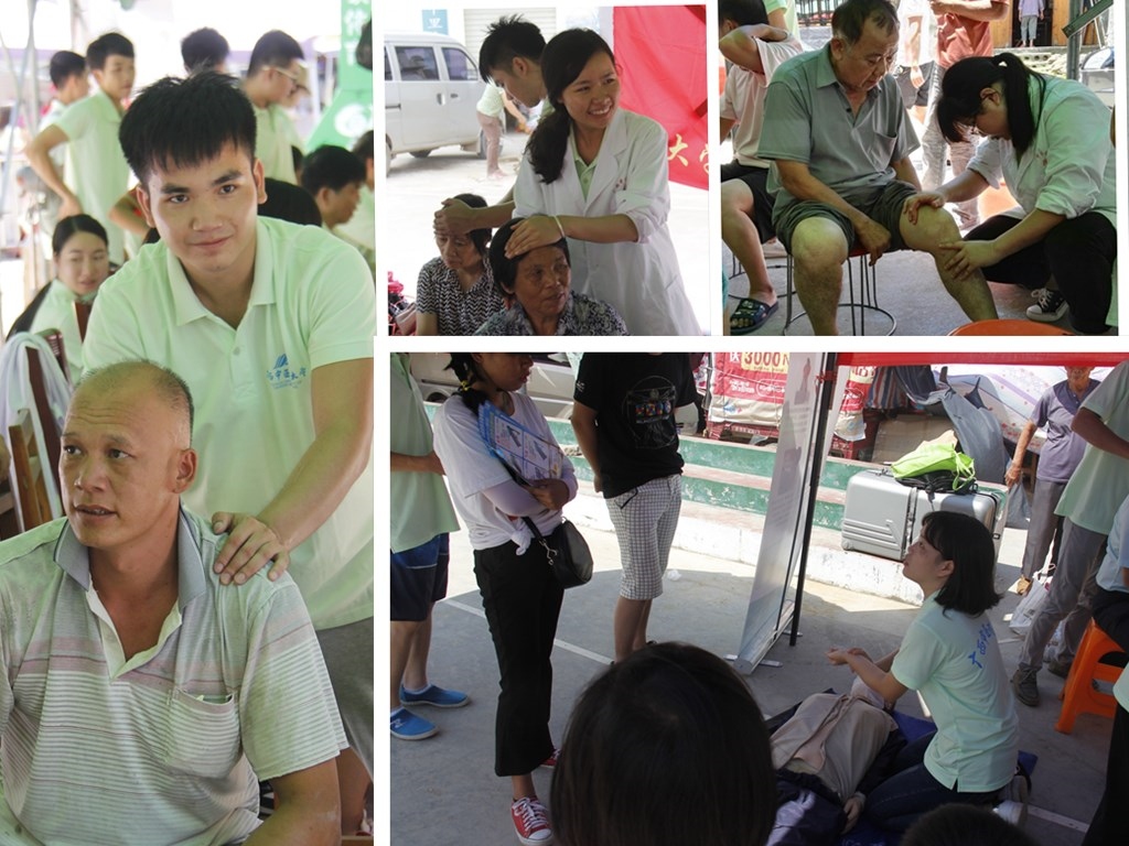 7月22日上午,到达中里乡龙山圩后,志愿者们便如火如荼地进行爱心义诊的准备工作。本次义诊以壮医药线陈雪斌教授、中医内科易自刚教授、针灸科梁立安教授、中医内科冼寒梅教授、中医妇科周卓秀教授、骨科夏天医师、针灸推拿科研究生王雄将等七位专家为居民们义诊,志愿者为乡民们普及急救知识、量血压和推拿按摩,形成“老专家老教授”+“大学生志愿者”的服务模式,老专家老教授保证了义诊服务的质量和群众信任度,大学生志愿者承担了大部分的接诊、量血压、针灸推拿等工作,在实践中得到了老专家老教授的指导,服务奉献同时增长了才干。正值大暑节气,老专家和志愿者顶着40度的高温,在圩镇上为全来求诊的乡亲们量血压、针灸推拿、诊脉开方、解决病痛,专家和志愿者尽管已经满头大汗,但仍然笑脸相迎,耐心地为前来就诊的乡民们解答疑难。前来求诊的群众络绎不绝,多次推迟收队时间,义诊时间从上午十点持续到下午4点,直到把最后一位看诊的乡亲看诊结束。