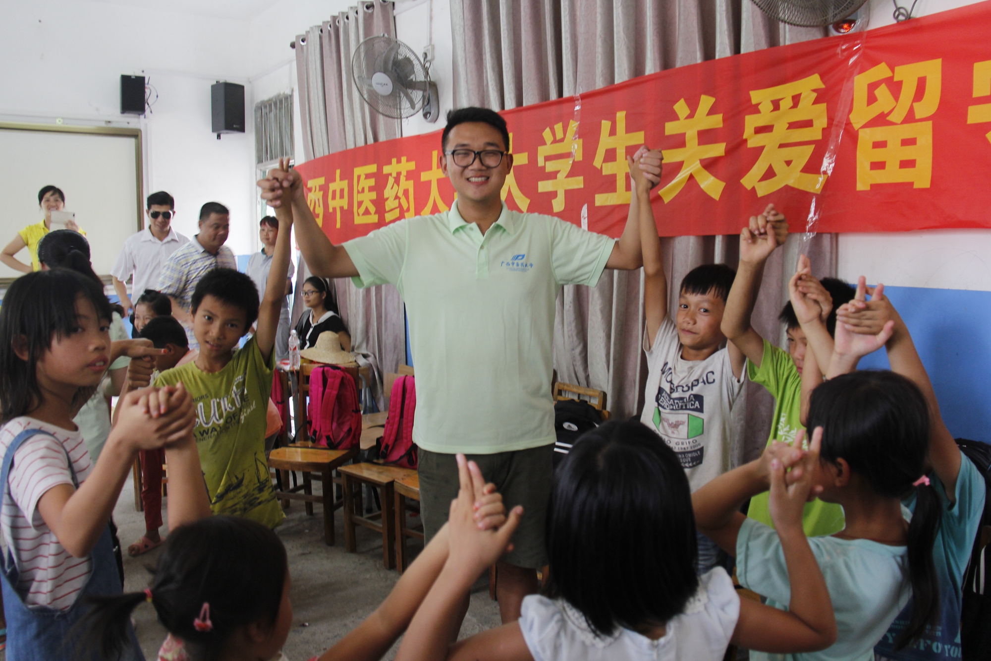 大学生志愿者与留守儿童一起做游戏
