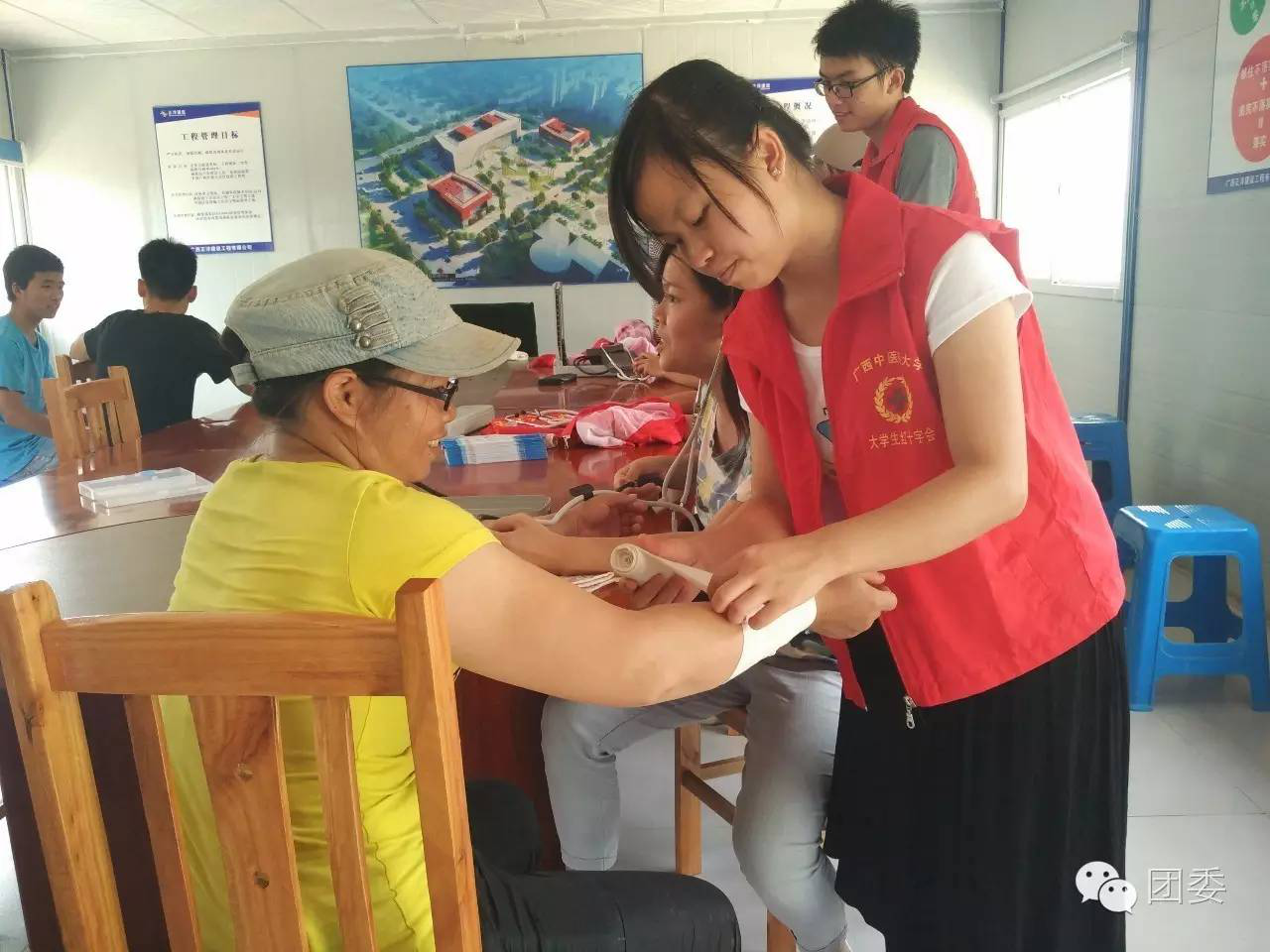 志愿者为当地居民、工人测量血压,并讲解血压的相关知识和对于高血压低血压的饮食注意事项,让居民、工人能了解自身的情况而注意生活习惯,注重身心健康。