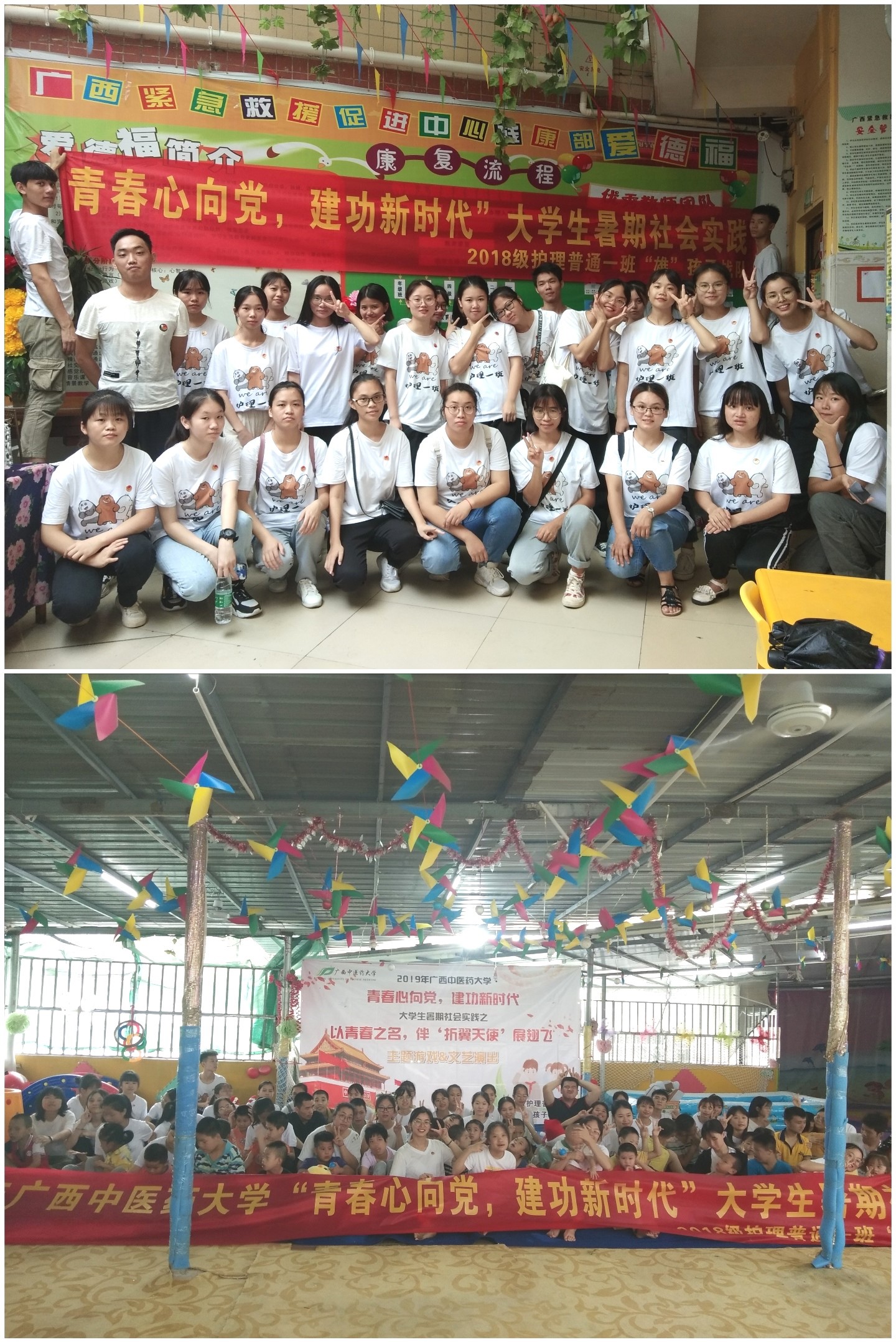 2019年7月9日至7月10日,广西中医药大学高等职业技术学院“雄”孩子战队的志愿者们来到了广西紧急救援促进中心爱德福帮扶中心开展以“青春心向党,建功新时代——以青春之名,伴折翼天使展翅飞”为主题的社会暑期实践活动。
