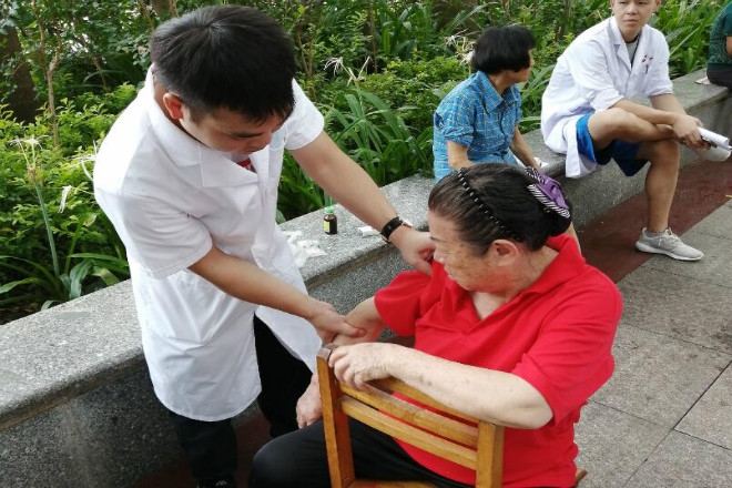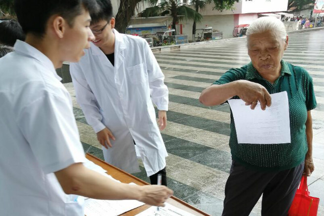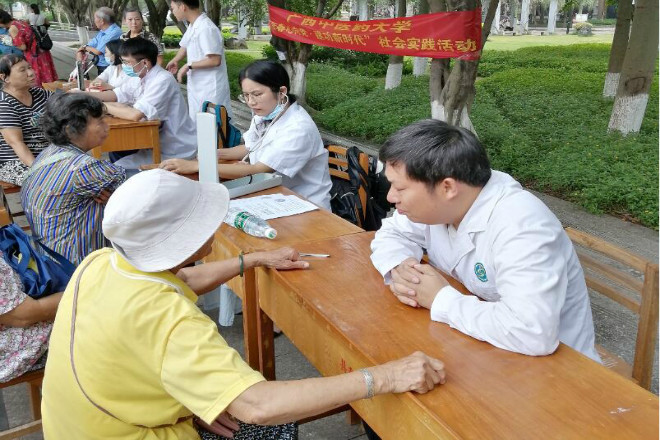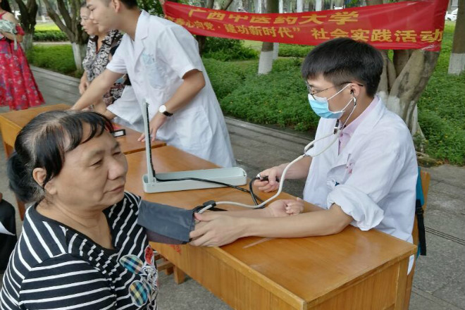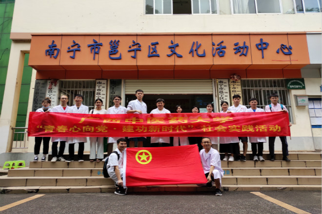 2019年7月11日,广西中医药大学2019大学生主题社会实践项目组“艾”心行动组16名同学,赴南宁市邕宁区蒲庙新兴社区广场开展“防艾宣教”及社区义诊活动。