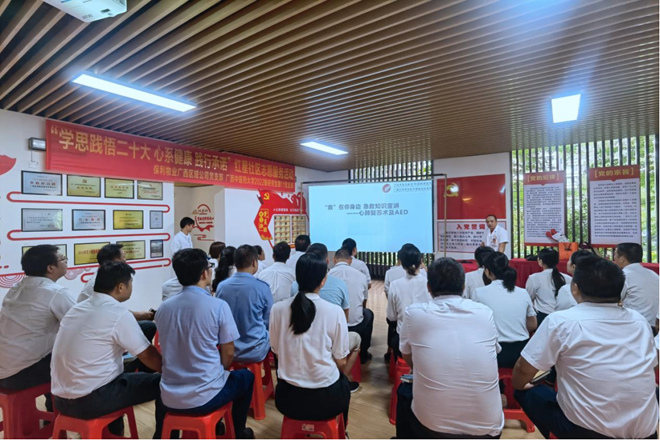 我校研究生院22级11班暑期社会实践小组先后分别于2023年06月19日、7月1日及8月21日在南宁市江南区中铁二院南宁分公司、青秀区保利领秀前城及霖峰壹号开展了急救知识宣讲和实践操作培训,包括心肺复苏(CPR)、自动体外除颤器(AED)、止血、包扎、固定以及搬运等。以急救知识宣讲和操作演练相结合,旨在推进应急救护全民化,助力基层健康服务。
