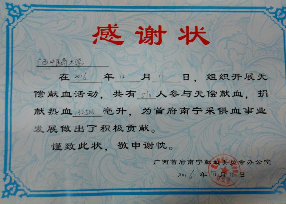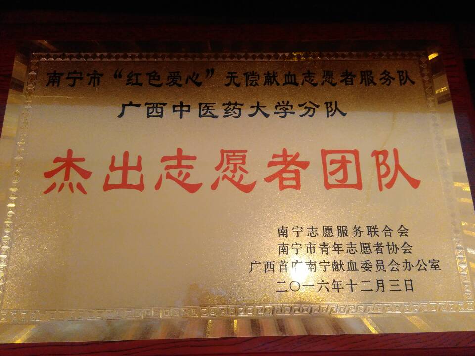 我校大学生红十字会2016年“血车进校”活动也于今天结束,南宁市“红色爱心”无偿献血志愿者服务队我校分队荣获南宁市“杰出志愿者团队”荣誉称号。