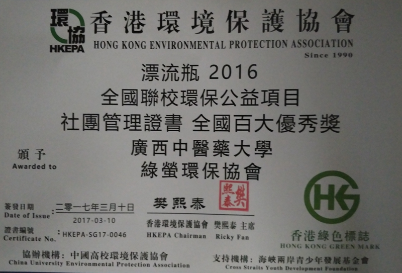 2017年3月14日,广西中医药大学绿萤环保协会在“漂流瓶”活动中荣获了“全国百大优秀奖”,在“水果贺卡”活动中荣获了“全国十大优秀奖”,这两个活动都是香港环境保护协会主办的全国公益类项目,通过公益项目来推广环保理念,努力让更多的高校学生加入保护环境的队伍之中。