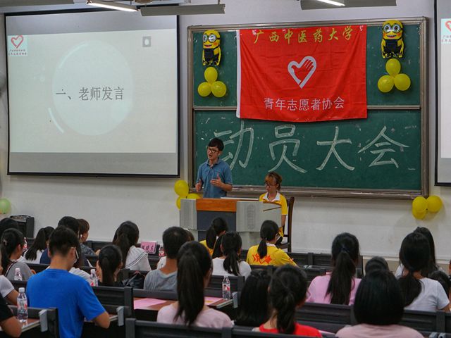 在会中,各社团的负责人就“四进四信”主题总结了社团一年的成果并提出了对社团的展望,以播放视频等方式让同学们更加了解“四进四信”的内涵。校团委办公室、社会实践部(合署)部长陈晓东老师作为嘉宾出席了广西中医药大学青年志愿者协会的动员大会,并进行了讲话,他全面阐述了“四进四信”的理念,声情并茂地解释了青年志愿的意义与责任。