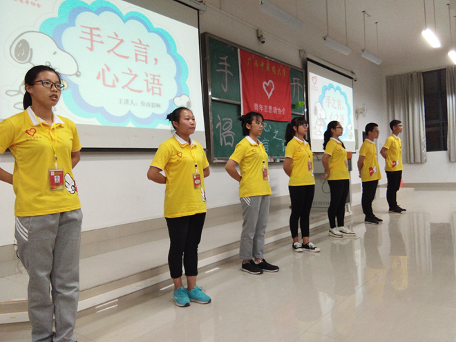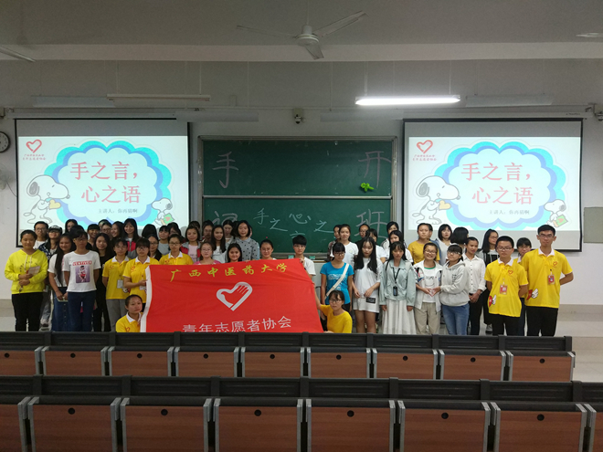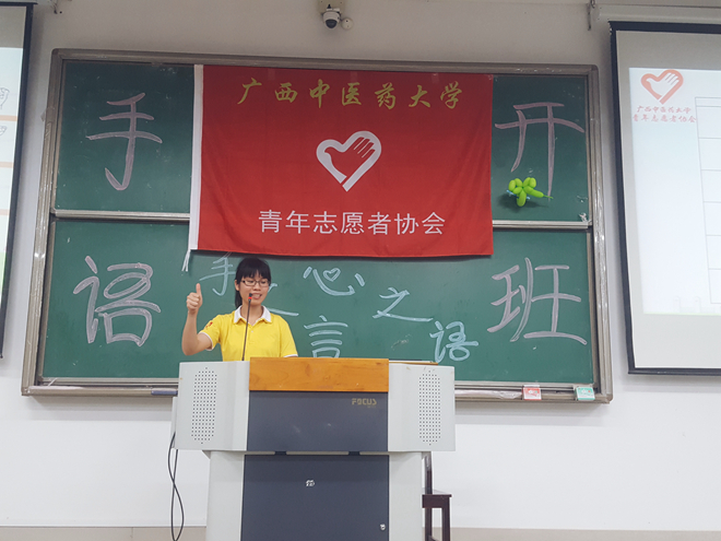 为了给全校师生提供一个学习手语的平台,2017年11月13日,广西中医药大学青年志愿者协会在广西中医药大学仙葫校区教学楼1-201开展了以“手之言,心之语”为主题的手语教学活动。