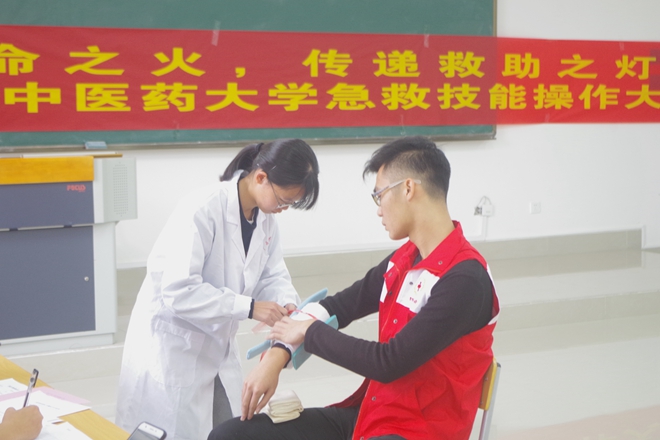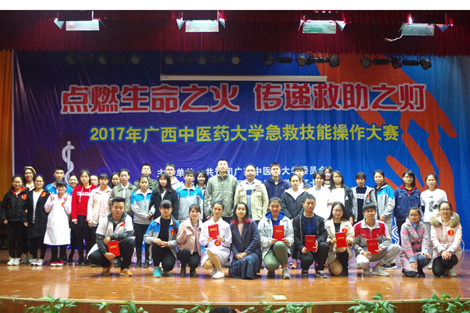 为了向广大学子普及应急救护知识,提高应急救护意识和能力,2017年12月10日,共青团广西中医药大学委员会、广西中医药大学大学生红十字会在我校仙葫校区举办了2017年广西中医药大学急救技能操作大赛。出席本次大赛的嘉宾有自治区红十字会应急救援队老师、团委老师以及校内兄弟社团代表。此次大赛分为团体赛和个人赛,经过精彩角逐,共有10支队伍参加团体赛,29位同学进入个人赛决赛。