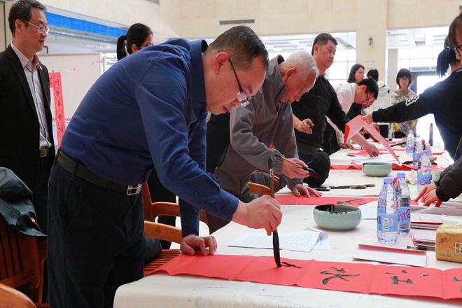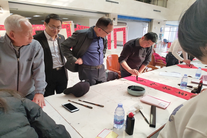 李建光老师、唐振宇老师、覃振林老师、励庆顺老师在活动现场现场挥毫泼墨,为全校师生写春联。徐方明主任、杨删书记和陈晓东老师也在活动现场进行指导,纷纷对书画协会此次的送春联公益活动的赞赏有加,鼓励并支持书画协会举办更多相关活动。