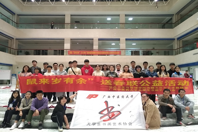 2019年12月6日-7日,公共卫生与管理学院传统文化与艺术教研室与广西中医药大学大学生书画艺术协会共同开展的迎新春送春联活动在我校仙葫校区图书馆二楼举行。我校大学生书画艺术协会指导老师李建光老师、校组织部部长唐振宇老师、校直属党委副书记覃振林老师、校党委徐方明主任、校团委杨删书记和陈晓东老师、百年乐制药厂励庆顺老师共同参与本次活动。