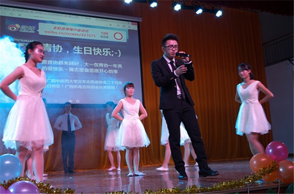 伴随着观众热情的欢呼声,广西高校志愿者联谊晚会暨广西中医药大学青年志愿者协会成立20周年晚会在时尚与环保相结合的开场秀——《环保时装秀》中拉开了序幕。在老师及青协现任负责人的发言后,晚会正式开始了。青协各前任会长们将对青协的深情融入到《最美的时光遇到你——青协》中,表达了志愿者对青协的爱与依恋;青协的志愿者们通过表演小品《一家人》来呼吁大家一起加入关爱老人的队伍中;吴睿老师演唱了《夜空中最亮的星》,借以为路人指明道路的明星来比喻永恒不变的志愿服务精神,并赞美了志愿者的无私奉献;《爱留下,守护他》在表演者的精彩演绎下,体现了关爱留守儿童这一深刻主题;其他由校内外各兄弟社团表演的节目,也展示了当代大学生的青春与活力。真正掀起晚会高潮的是纪念青协成立20周年生日蛋糕的出现,大家不约而同地高唱生日快乐歌,为青协送上最诚挚的祝福。最后,在全体合唱会歌《爱就在身边》的歌声中,此次晚会圆满地落下了帷幕。