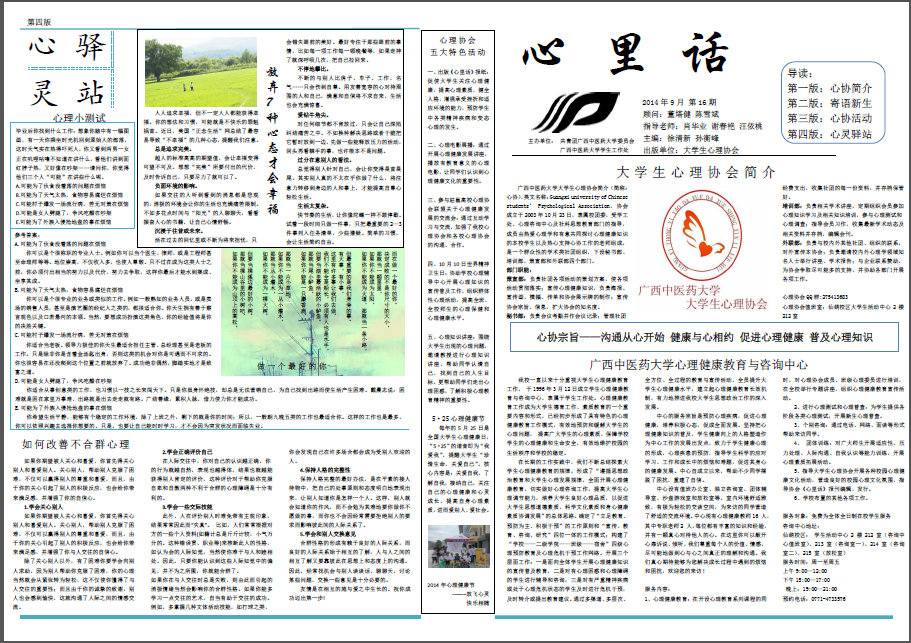 心理协会简介 发布时间:2015-11-20 20:37:33 浏览次数: 次 【字体:小 大】 广西中医药大学大学生心理协会,是由热爱心理学和有意共同探讨心理健康知识的本校学生以及热心支持心协工作的老师组成,是一个群众性的学术类社团组织。心理协会的指导老师是我校心理健康教育与咨询中心的谢春艳教授和汪依桃老师。 分享到: 【打印正文】