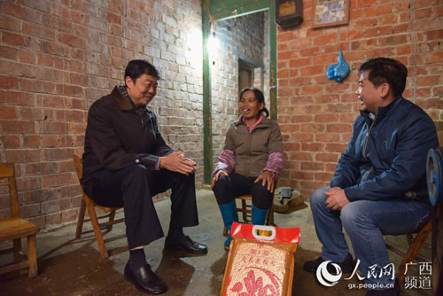 广西中医药大学党委书记尤剑鹏(左)到贫困户梁世贵家中慰问