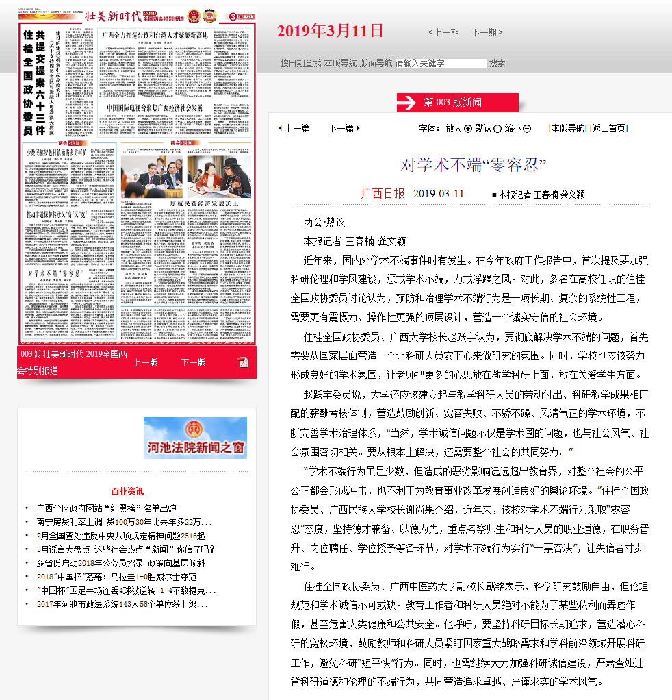 ——广西日报2019年3月11日三版 新闻标题《对学术不端“零容忍”》