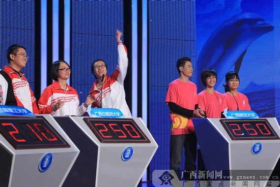 广西中医药大学代表队抢得最终的答题权,冠军在望乐不可支。广西新闻网记者 邓昶摄