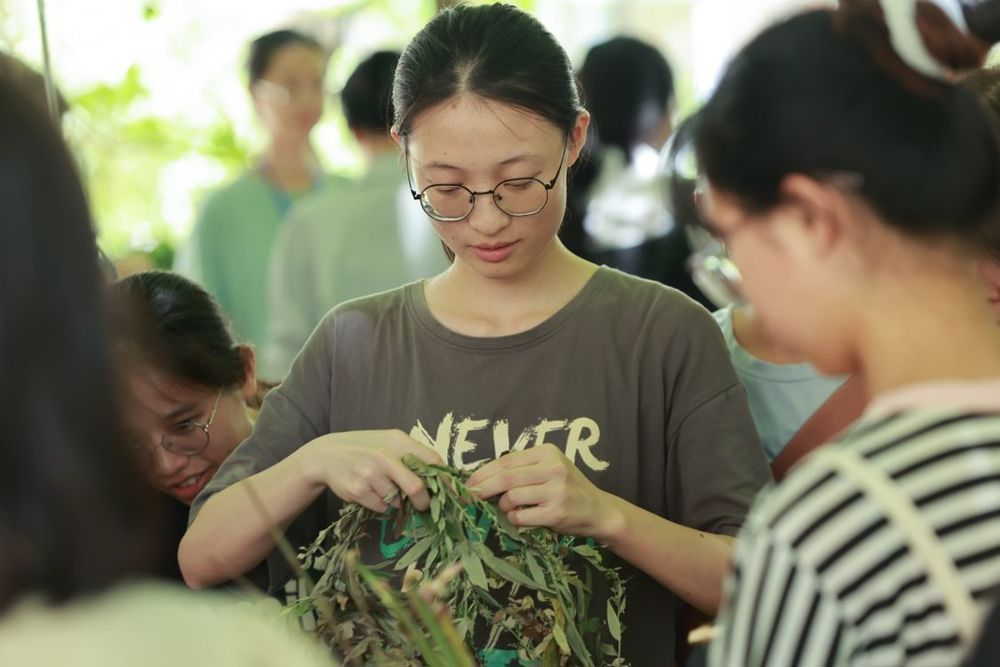 今年,该校还依托“一站式”学生社区组织线上线下开展“青艾飘香端阳到,药香四溢壮瑶邀”特色端午节活动:“灭百毒,趣点雄黄酒”“观诗海,慧争文虎”“祈福乐,共饮药茶香”“逛药市,囊中探秘”“辨百药,火眼金睛识真伪”“竞六艺,投壶学射礼”“斩千邪,艾香环健康”“端午总动员,棕享好时光”等八个特色活动,将端午习俗带进校园,将中医药文化融入民族节日。抿一杯药茶,点一点雄黄,绕一顶艾叶环,围绕在幽幽艾香间,浸润在热闹的节日氛围里,越来越多的同学参与进来,沉浸式体验着端午特色,感受中医药的魅力。