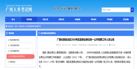 根据《事业单位人事管理条例》(国务院令第652号)、《中共中央组织部 人力资源社会保障部关于进一步做好事业单位公开招聘工作的通知》(人社部发〔2024〕57号)、《广西壮族自治区事业单位公开招聘人员实施办法》(桂人社发〔2011〕155号)等文件精神,我区区直事业单位计划面向社会统一公开招聘一批工作人员,现将有关事项公告如下。