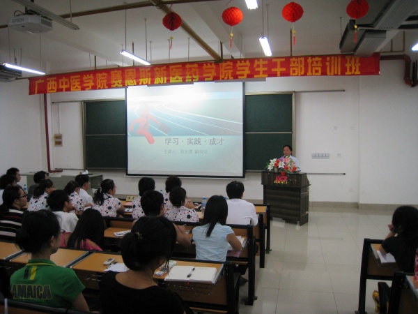 6月7日晚,赛恩斯新医药学院第三届学生干部培训班在赛阶103教室正式开班。以“学习·实践·成才”为主题,广西中医学院党委副书记项光谋莅临赛恩斯新医药学院作开班讲座。赛恩斯新医药学院常务副院长谢丽莎、党总支书记徐方明出席,教师代表、学生干部共250人参加讲座。