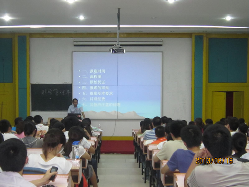 2013年6月18日晚,由广西中医药大学研究生学院和广西中医药大学财务处联合主办、研究生会承办的《财务报账基础知识专题讲座》在我校明秀校区西梯一教室隆重举行。讲座由校财务处副处长韩若斌主讲、研究生学院方卓院长主持。
