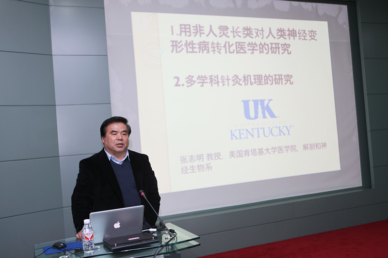 张志明教授以自己的科研思路和经历为例,首先向大家介绍了电针刺激特定穴位,对帕金森氏病的非人灵长类动物模型产生的影响。并介绍了课题的研究旅程,他的研究团队,工作中自己的感悟,从转化医学角度详细介绍了非人灵长类动物模型对申报基金类项目的意义。最后对师生提出的问题作了真诚而详细的解答,他鼓励师生们利用自己的智慧发展自己的创造能力,提升科研水平,并对科研合作表现出浓厚的兴趣。精彩的报告得到了师生的好评。