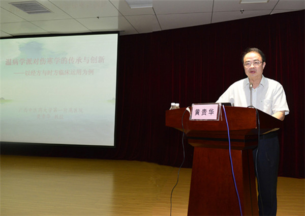 在讲座中,黄贵华院长以伤寒学派和温病学派为例,全方位阐释了医学流派与中医学术的传承创新问题。黄院长给大家再次复习了伤寒学派的学术核心:即六经辨证论治体系的创立,进一步解释了六经的概念,六经病的性质、传变规律以及治法、主方,阐明了伤寒派学术侧重“热归阳明,寒归三阴”的学术观点。伤寒学重视阳明热化的辨证论治给温病学派奠定了学术基础;重视三阴寒化的辩证论治,既给扶阳学派奠定了学术基础,也给温病学派留下学术发展的空间。温病学派以“卫气营血辩证和三焦辩证的创立”为学术核心,温热类病多用卫气营血辩证,湿温多用三焦辩证。黄院长又从六个方面(1.太阳病汗法,为温病学派用于卫分证和上焦证的治法中;2.阳明病理法方药为温病学派应用于气分证治疗;3.阳明病一些症状或变证也包含了营血分的表现。4.阳明病和太阴病的理法方药为温病学派用于中焦辩证治疗;5.脾胃分治思想源于仲景脾胃学说;6.胃 阴学说是叶天士对仲景脾胃学说的丰富和发展)阐述了温病学派对伤寒学派的传承与创新。黄院长讲课思路清晰、思维活跃、深入浅出,明白易懂。讲座中更以常用 的经方和时方为例,令人茅塞顿开又倍觉实用;名家小典故手到擒来,不时幽上一默,令会场不时爆出阵阵笑声。大家都听得津津有味,受益匪浅。