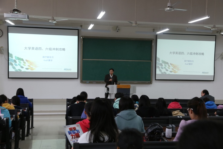 为了帮助同学们熟悉《新东方多媒体学习库》的使用方法,获得更广阔的信息源,全面了解英语四、六级资讯,熟练掌握英语四、六级考试技巧,提高英语四、六级考试通过率,11月29日,图书馆特邀请南宁新东方学校黄宇校长到我校仙葫校区1-101、明秀校区西梯二教室分别进行了讲座。蒋才武馆长主持此次讲座,400余名学生听取了讲座。