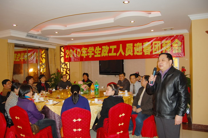 [图片]学生工作处举办2010年学生政工人员迎春团拜会 来源:学生工作处 作者:黄鑫 日期:2010-01-26 点击数:次 分享到: 1月25日晚,学生工作处举办2010年学生政工人员迎春团拜会。学院院长朱华,党委副书记纪委书记董塔健,副厅级调研员陈雪斌以及部分党政部门的领导参加了团拜会。团拜会由学院助学贷款办公室主任、学生工作处副处长刘竑清主持。学院院长朱华对一年以来学院学生工作所取得的成绩表示了充分的肯定,对整个学生政工人员队伍的稳定和发展提出期望。学生工作处处长冼锦华老师致辞,他代表学生政工人员向关心学生工作的各位领导、老师表示感谢,并表示将尽职尽责地做好学校学生工作。 学院院长朱华致辞 学生工作处处长冼锦华总结2009年学生工作 (学生工作处黄鑫) 打印正文 关闭本页