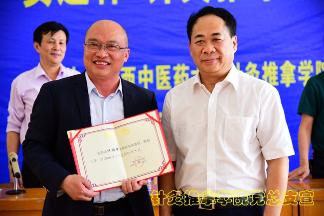 在开幕式上,董塔健、罗伟生、何顺峰分别作了讲话,罗伟生代表学校向何顺峰先生颁发了广西中医药大学客座教授的证书,何顺峰先生向荣获2017“安迪自强奖学金”的同学颁发了奖学金。针灸推拿学院党总支书记蒋闽义主持了开幕式。