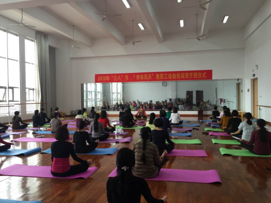 为了进一步活跃我校教职工业余文化生活,促进教职工的身心健康,喜迎“三·八”妇女节的到来,学校举办2016年“杏林风采”教职工瑜伽培训班。3月8日上午10:00,瑜伽培训班在仙葫校区体育馆二楼形体舞蹈馆1教室举行开班仪式。校党委副书记、纪委书记、工会主席杨连招出席开班仪式并讲话,100多名爱好瑜伽运动的教职工代表参加了本次开班仪式。仪式由校工会常务副主席李欢澄主持。