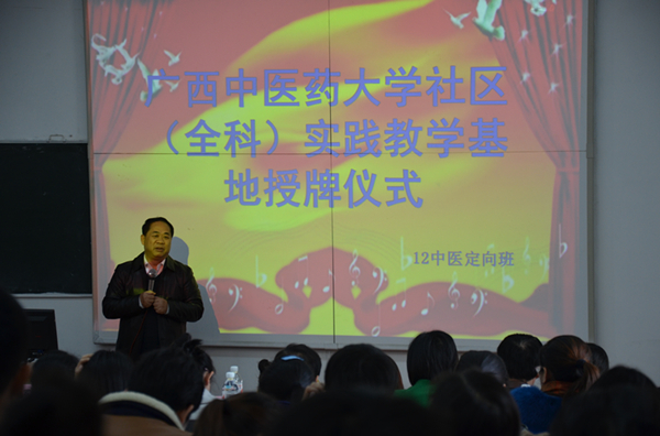 2016年3月10日下午,广西中医药大学社区(全科)实践教学基地授牌仪式在明秀校区西梯一教室举行。我校副校长罗伟生、教务处处长唐梅文、副处长刘武、学校与第一临床医学院相关科室领导老师及南宁市十六所社区(卫生院)医疗服务中心的领导共25人出席了本次活动。2012级中医学(农村订单定向医学生免费项目)专业全体同学一齐参加。