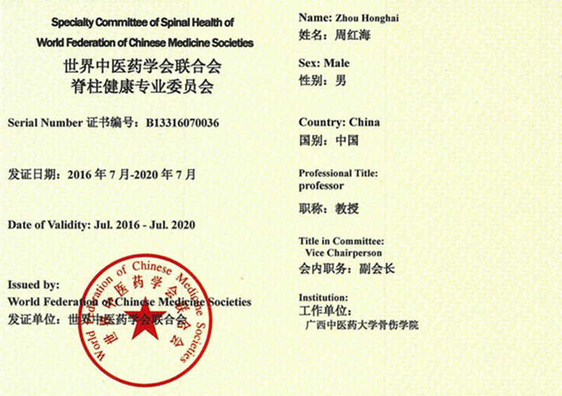会后,我校中医骨科专家韦贵康教授被聘为该专业委员会名誉会长,周红海教授为第一届副会长与专业技术标准审定委员会成员,陆延医师、田聪医师被聘为会员,经专业委员会网上七天公示无异议,由世界中医药联合会寄来证书。