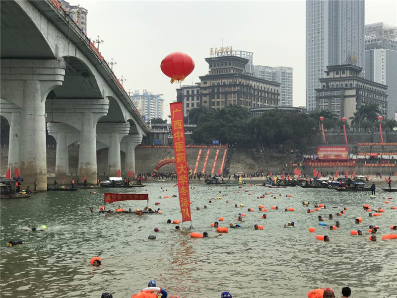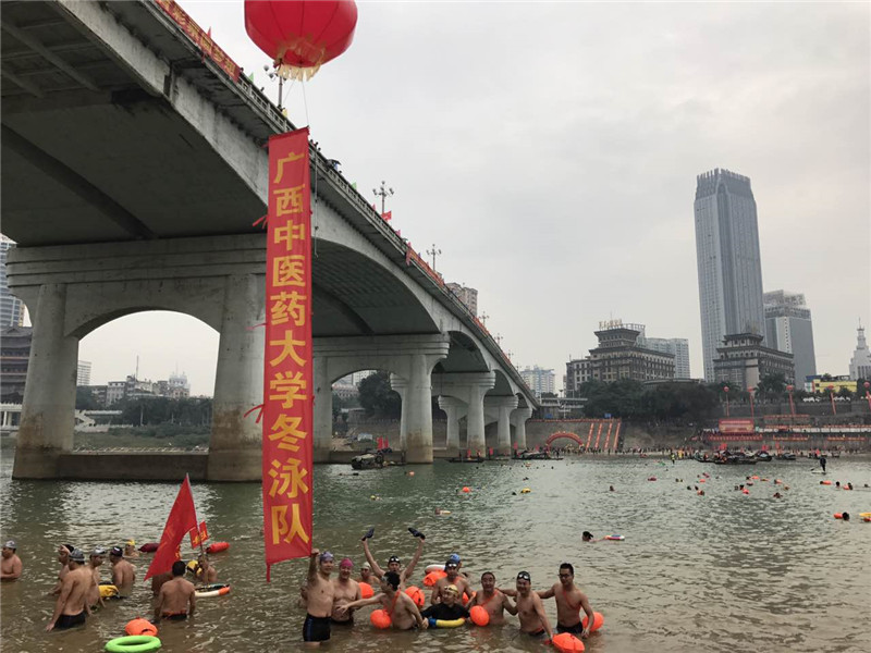 2017年1月1日早上8:30,2017年南宁冬泳邕江活动在邕江大桥附近水域举行。邕江冬泳为了纪念毛泽东同志畅游邕江而举行,至今已经有59年的历史,广西中医药大学多年来均是此项活动的参与者。今年由12名教工组成的代表队顺利完赛。