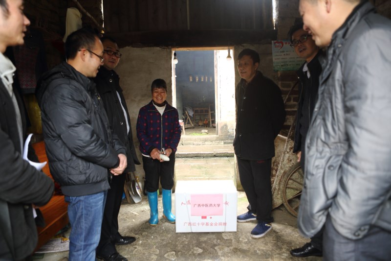 董塔健一行来到平朗乡双窑村,在周德喜同志及平朗乡领导的陪同下慰问了贫困户刘建中。“就要过年了,我代表广西中医药大学提前来给你们拜个年,祝你们身体健康,事事如意!”董塔健对刘建中的父母及女儿说。在平朗社区,董塔健一行对贫困户进行了集体慰问,并来到上石梯村贫困户黄爱勤家中慰问,送上了慰问品,并祝他们新春快乐,阖家幸福!