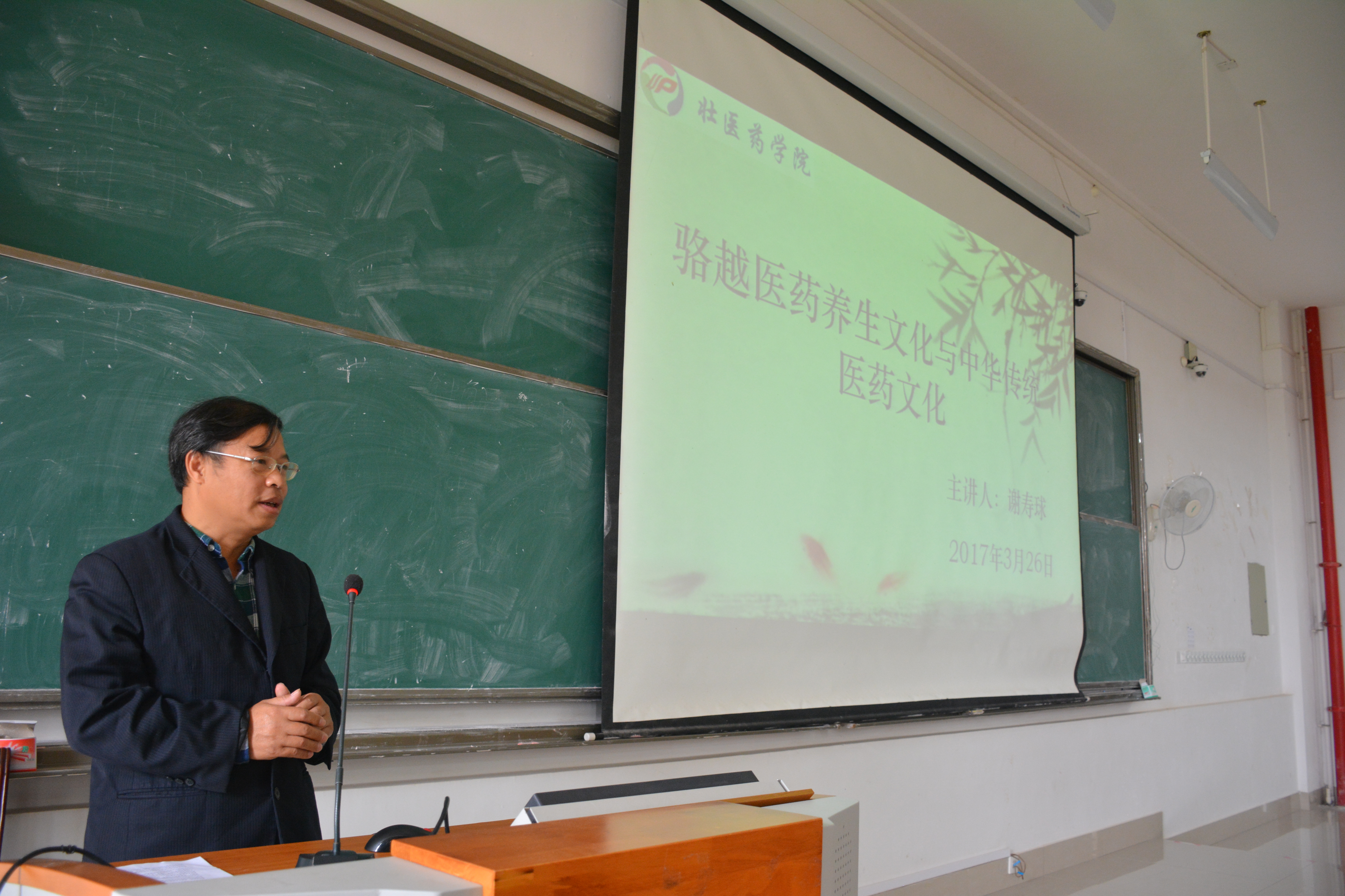 为传承弘扬民族医药文化,在“壮族三月三”这个广西盛大节日即将到来之际,2017年3月26日,壮医药学院分别开展了“骆越古医药文化对中华传统医药文化的影响”、“壮医自信 ,砥砺前行—谈壮医治学与成才之路”两场专题讲座,讲座邀请了广西骆越文化研究会谢寿球会长、壮医药学院壮医药学院副院长韦英才教授作为主讲嘉宾。广西中医药大学庞宇舟副校长、壮医药学院蓝毓营院长、壮医药学院韦杏副教授、壮医药学院分团委副书记刘婷老师、壮医药学院张青槐老师分别出席了两场讲座。