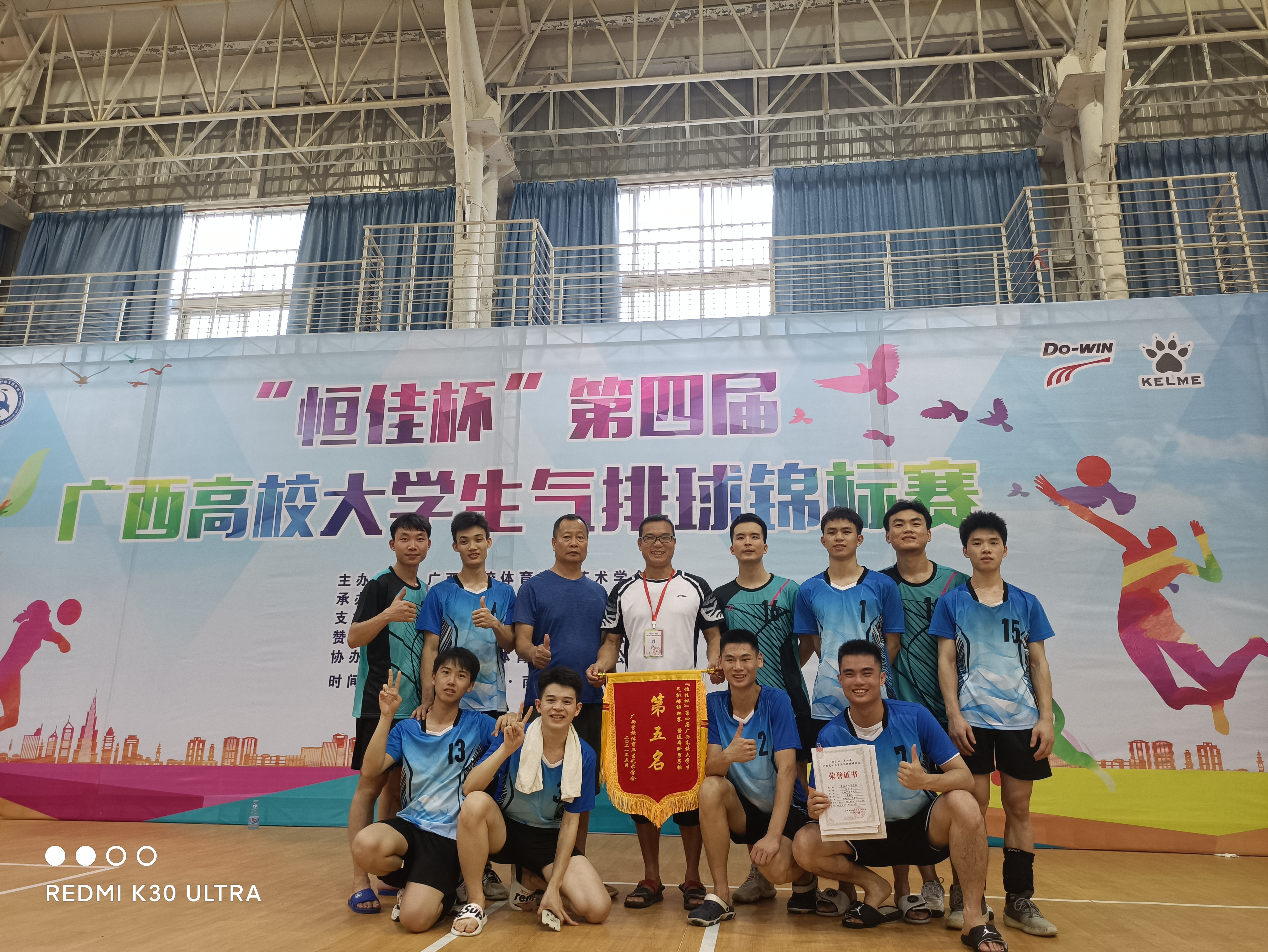 我校男子气排球队在教练徐锡杰和韦金亮两位老师的带领下,在比赛中一路过关斩将,以小组第一名进入八强,在八进四的关键赛中,第三局决胜局以两分惜败给南宁学院代表队。在5-8名排位赛中,先后战胜桂林理工大学南宁分校和广西大学行健文理学院代表队,最后获得第五名的好成绩。