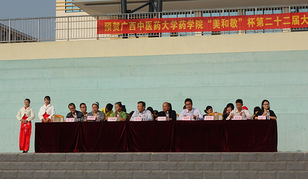 2013年10月26日,广西中医药大学药学院“美和敬杯”第22届大学生田径运动会在仙葫校区田径场举行。出席本次运动会开幕式的嘉宾有桂林美和敬茶叶有限公司总经理徐球,广西中医药大学学工处处长肖华业,体育部副主任石荣群,药学院党委副书记李豫萍,药学院副院长卢汝梅,药学院学生办公室老师以及各部门、二级学院师生代表、药学院一千多名学生出席了运动会开幕式。