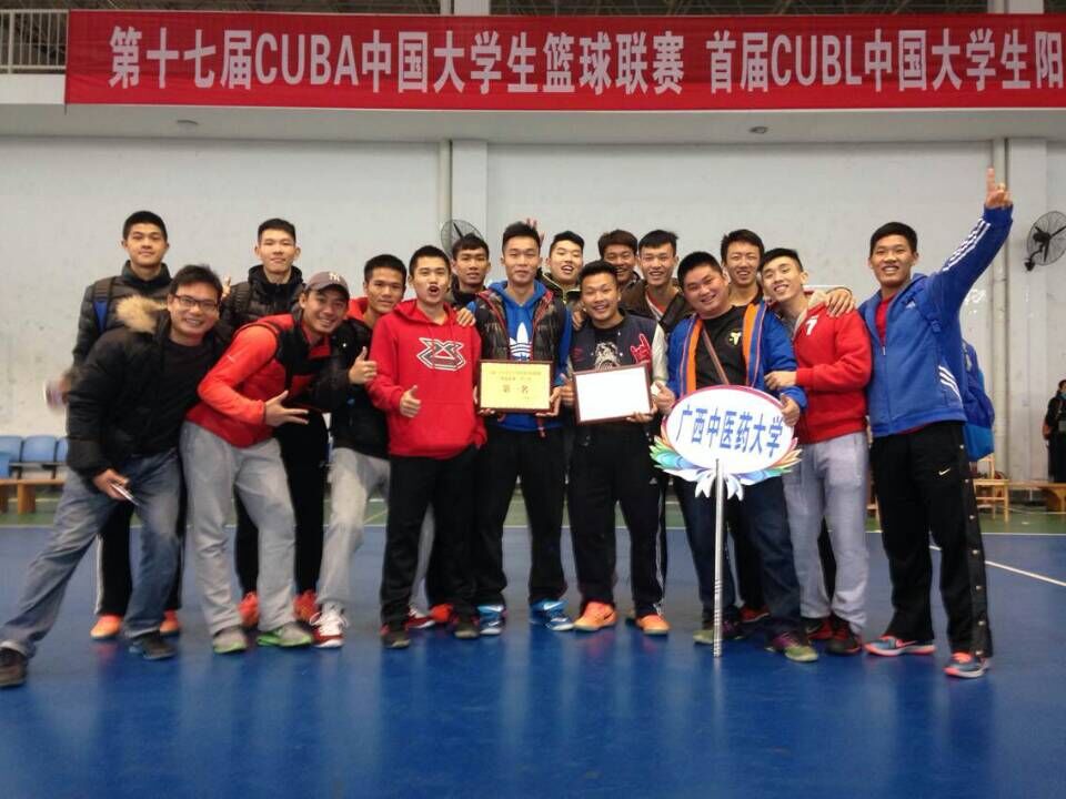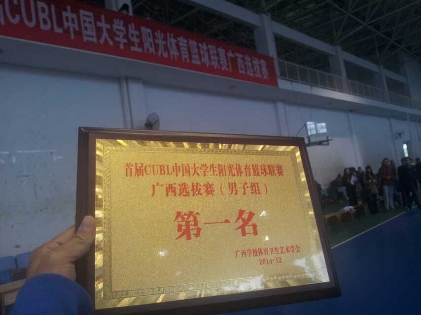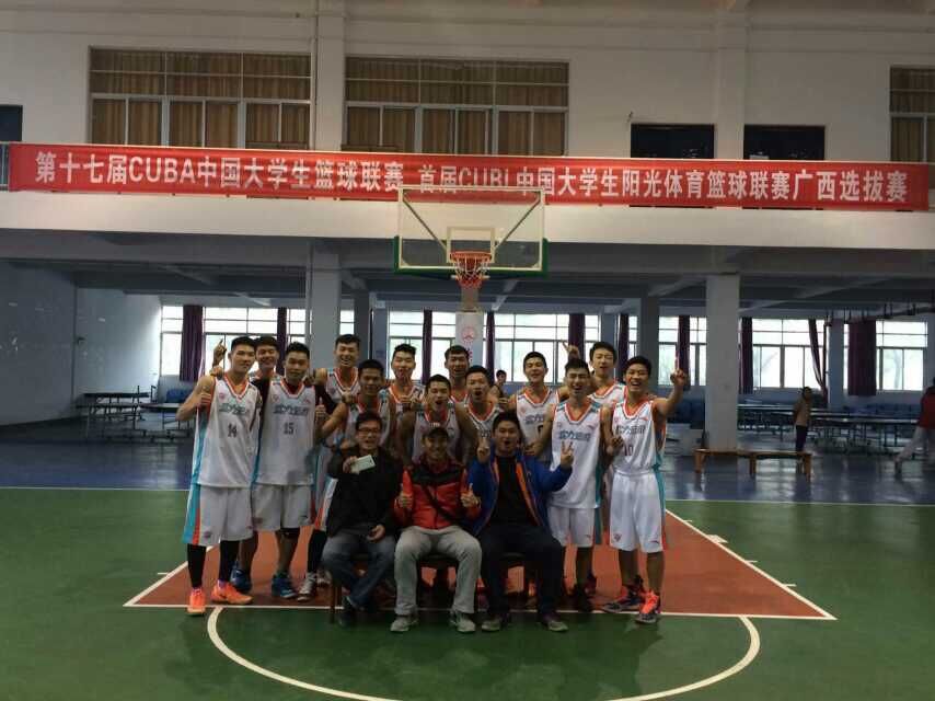 第十七届CUBA中国大学生篮球联赛 首届CUBL中国大学生阳光体育篮球联赛广西选拔赛,于2014年12月25在广西师范大学雁山校区比赛落下帷幕。本次比赛由广西壮族自治区教育厅体卫处主办,来自全区13所大学的篮球球代表队参加CUBL比赛。经过六天九场比赛激烈的角逐,我校男子篮球在领队石荣群副主任、主教练丘大为老师的带领下全队上下齐心协力,斗志昂扬,迎难而上,无畏伤病,拼搏到比赛最后一秒钟,以精神饱满的状态去迎战每一场比赛,最终以全胜不败的战绩摘得了本次比赛的桂冠,获得代表广西高校参加CUBL中国大学生阳光体育篮球联赛全国总决赛的资格。