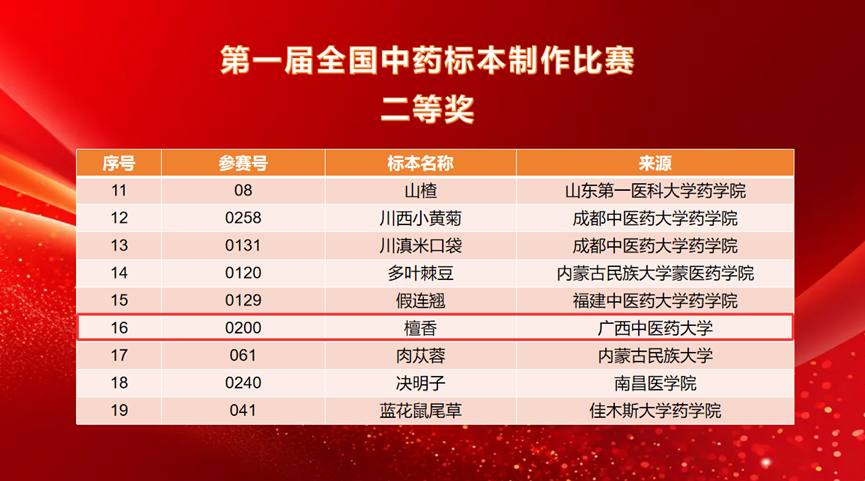 经过前期的精心准备与选拔,我校壮瑶药研究平台派出3名教师带队,11名研究生参赛,共提交16件标本作品。其中,药用植物标本《檀香》(指导老师:朱华、戴忠华)荣获二等奖,《假鹰爪》《重瓣臭茉莉》《穿心莲》《小粒咖啡》《蔓荆》《赪桐》《磨盘草》《佩兰》八件药用植物标本荣获三等奖,充分展示了我校在中药标本制作与中医药教育领域的深厚实力与学子昂扬向上的精神风貌。