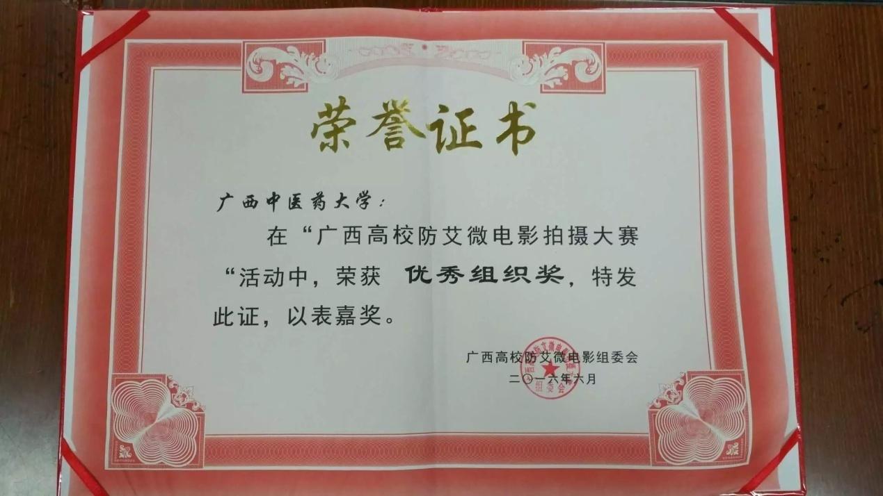 2016年6月3日,广西高校防艾微电影大赛颁奖典礼在广西艺术学院成功举办,我校荣获优秀组织单位奖。