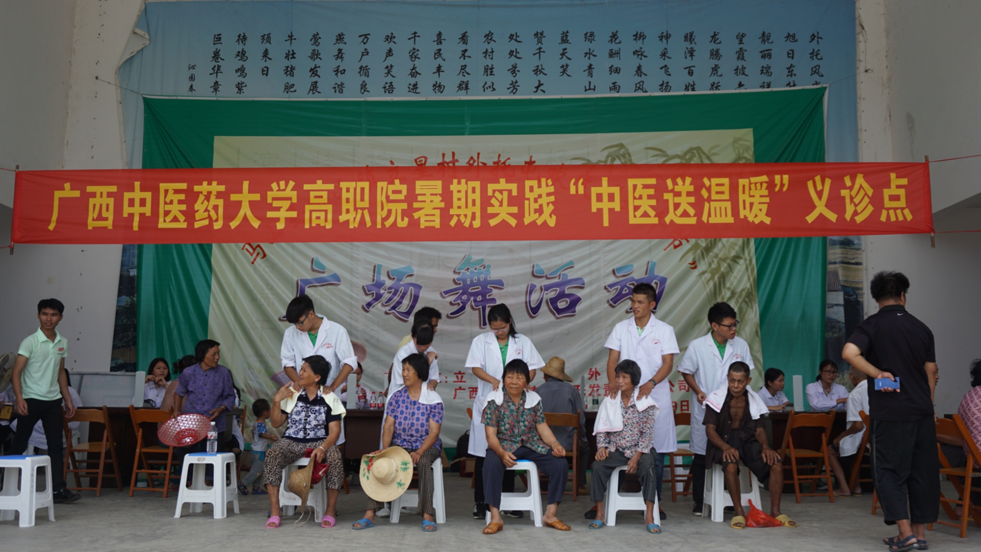 2016年7月21日至23日,“青马”大学生骨干精英队(2016年全国大中专学生志愿者暑期文化科技卫生“三下乡”社会实践重点团队)一行60人到广西贵港市港北区中里乡开展大学生暑期文化科技卫生“三下乡”社会实践活动,活动以“青春建功十三五,携手共筑中国梦”为主题,开展义诊、文艺下乡、关爱留守儿童和急救知识进乡村等活动,7月22日上午,志愿者们到达中里乡龙山圩开展义诊活动,专家们为乡亲看诊开药、志愿者们为乡民们普及急救知识、量血压和推拿按摩。当天下午,部分志愿者来到龙山村初级中学开展“关怀留守儿童”活动,给30名留守儿童送去了书包和文具,并和他们一起玩游戏,度过了一段愉快的时光。当天晚上,志愿者们在龙山圩的中心舞台进行了一场精彩纷呈的文艺晚会,赢得了乡民们的阵阵喝彩。7月23日上午,专家和志愿者们又赶赴中里乡中里圩进行第二轮爱心义诊。