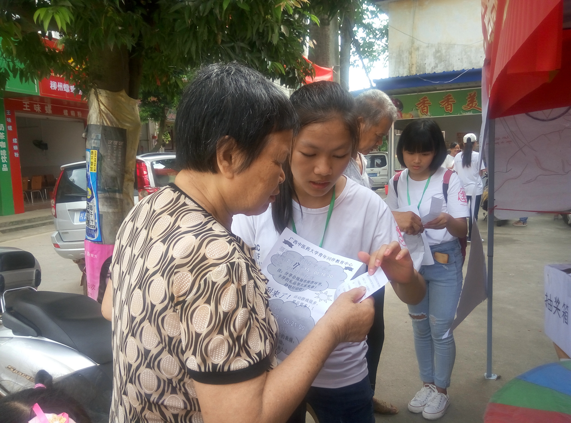 广西中医药大学大学生红十字会于7月16日在南宁市武鸣区渡头社区和正洋建设工地开展了为期两天的爱心宣讲进社区、工地社会实践活动。活动以急救知识宣讲和献血知识、造血干细胞捐献知识、防艾知识宣传为主,以量血压、医学手法按摩、有奖竞答等多样形式传播红十字的“人道、博爱、奉献”精神。