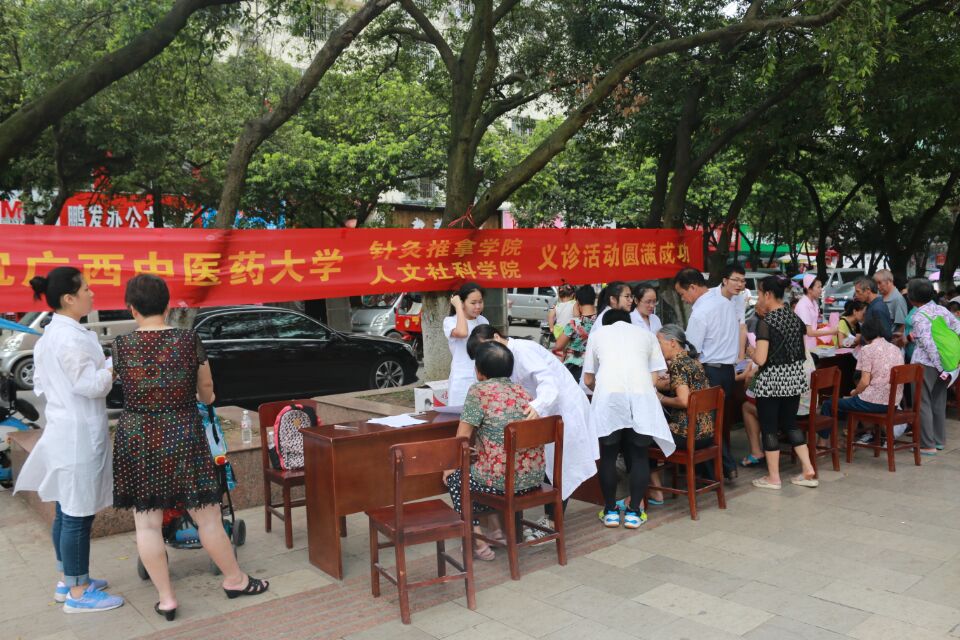2016年7月14日至7月16日,针灸推拿学院联合人文社科学院赴罗城县、大化县开展暑期社会实践义诊与健康调查活动。针推学院潘立老师、人文学院宋南老师和渠淑洁老师参加了此次活动。7月15日上午,实践团队在罗城大广场开展义诊和健康调查活动。针推学院主要负责义诊活动,志愿者们为居民进行艾灸、手法按摩和量血压等志愿服务。人文社科学院主要对前来参加义诊的群众进行健康知识的调查,两个学院相互配合共同合作,吸引了很多的群众前来咨询与体验。