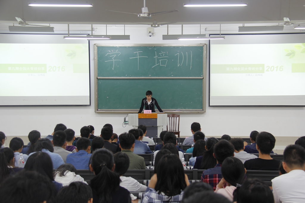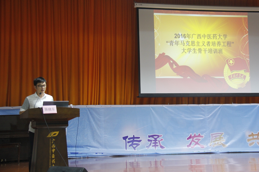 10月28日晚,我们在小礼堂举办了2016年广西中医药大学校团干培训班暨”青年马克思主义者培训工程”大学生骨干培训班的开班仪式以及陈晓东老师的专场讲座。本次培训由校团委组织部部长陈晓东老师担任主讲,校团委宣传部干事黄英老师出席,校级、院级各级学生干部代表参加了本次培训。本次讲座始终围绕作为一名学生干部应具有的四个能力展开论述,即”听、说、读、写”。 首先,晓东老师用“好记性不如烂笔头”这句大家耳熟能详的名言为学生干部阐述了如何去听;其次,他介绍了锻炼好口才的重要性,让学生干部领略到了说话的魅力;再次,他从阅读技巧、文书写作等两个方面对大家进行了培训,为学生干部当前存在的问题指明了改进方向。晓东老师的演讲以及与同学们间的互动,让培训会场响彻热烈的掌声。
