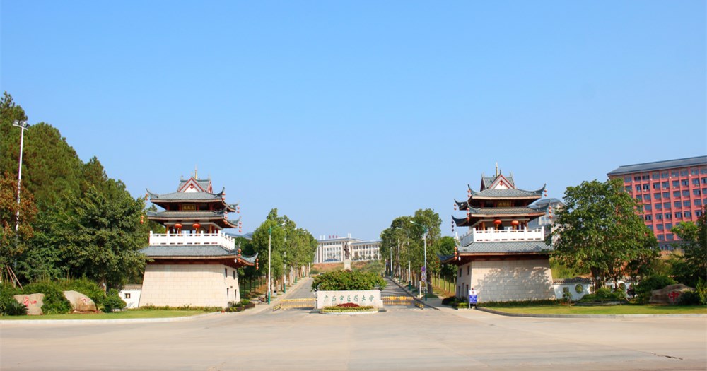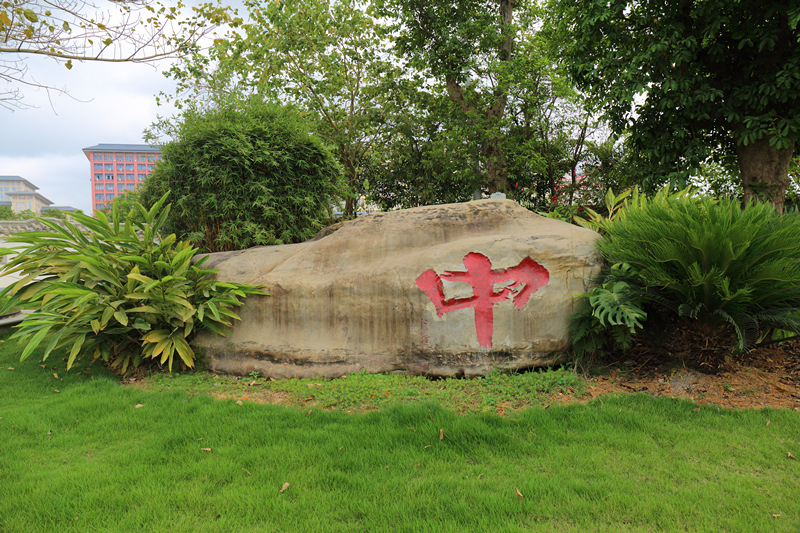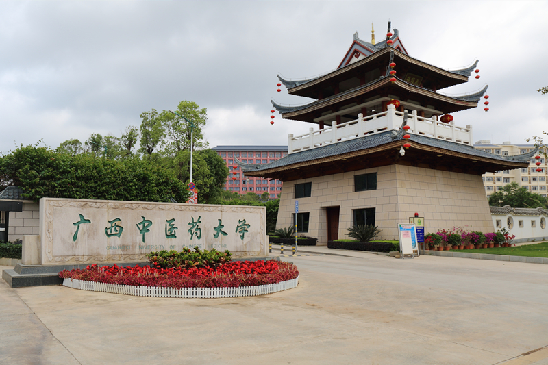 校门的两侧大石上分别镌刻有中国书法协会主席张海题写的“中”“和”朱红大字,与晨钟暮鼓楼、仲景大道等系列景观配合,象征着走进广西中医药大学,将融入到中国传统文化的最高境界之中,那就是“致中和,天地位焉,万物育焉”。