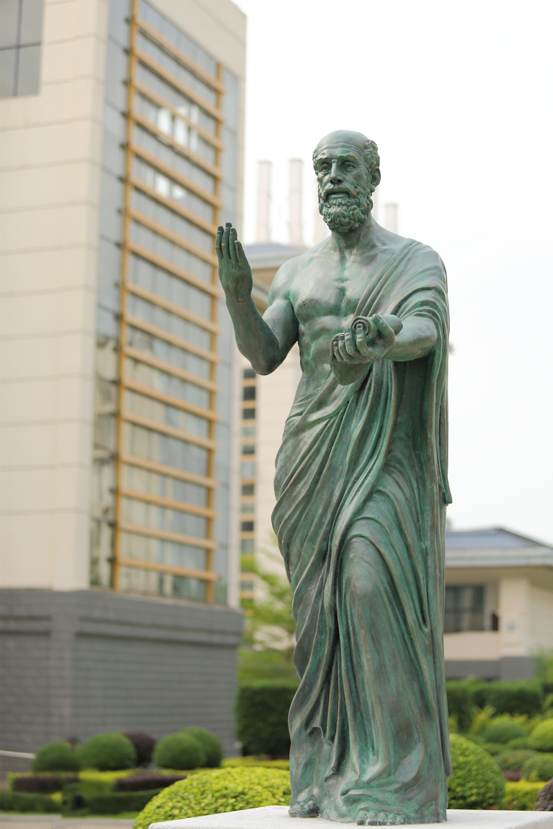 希波克拉底则髯发卷曲,深目高鼻,体态健壮,斜挂在身上的长袍飘逸齐地,裸露的右肩肌肉线条有力而富有动感。一手托着羊皮书卷,一手微曲比出四指,仿佛意指四体液学说。